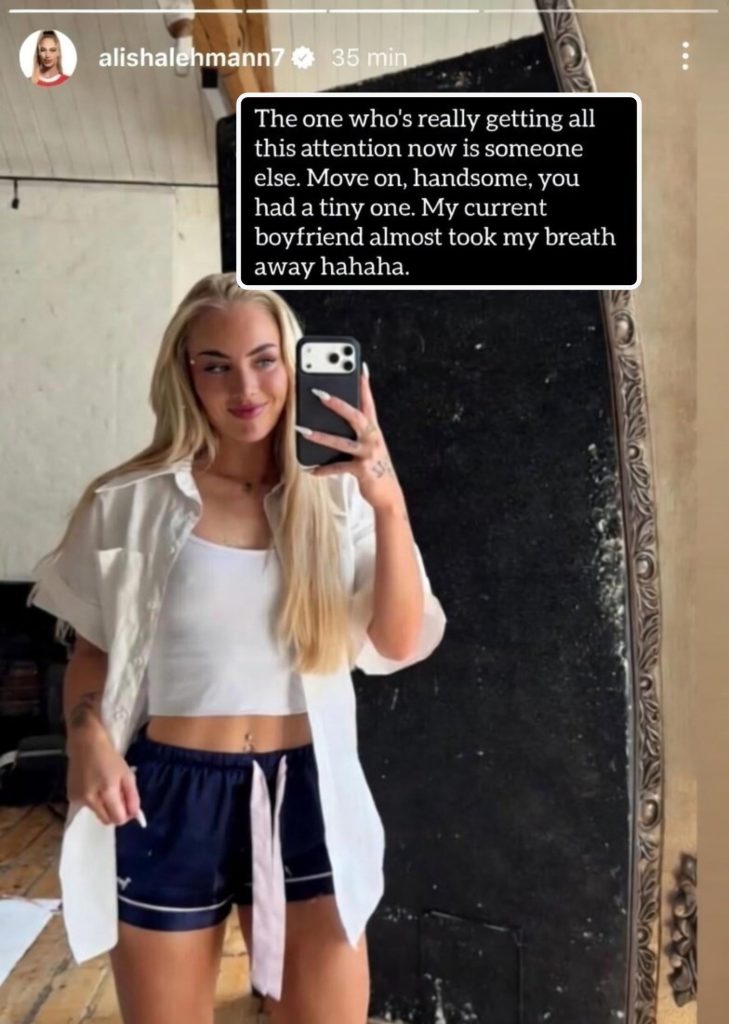Lehmann clocked the comment and went straight to her Instagram Stories with a reply for the ages. “The one who’s really getting all this attention now is someone else,” she wrote. “Move on, handsome, you had a tiny one. My current boyfriend almost took my breath away hahaha.”