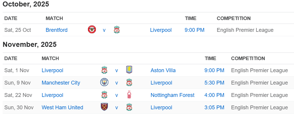 Liverpool’s upcoming Premier League fixtures. (Credit: ESPN)