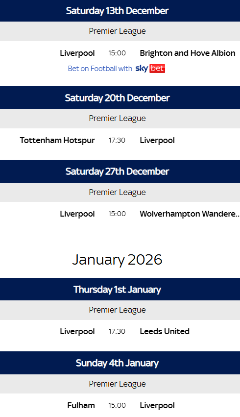 Liverpool’s upcoming fixtures. (Credit: Sky Sports)